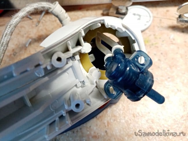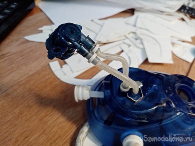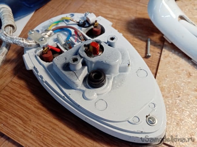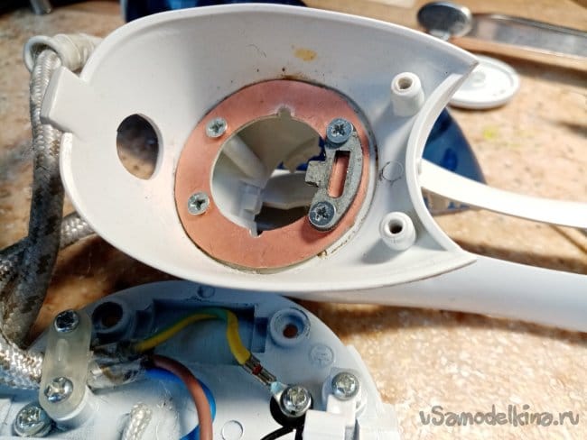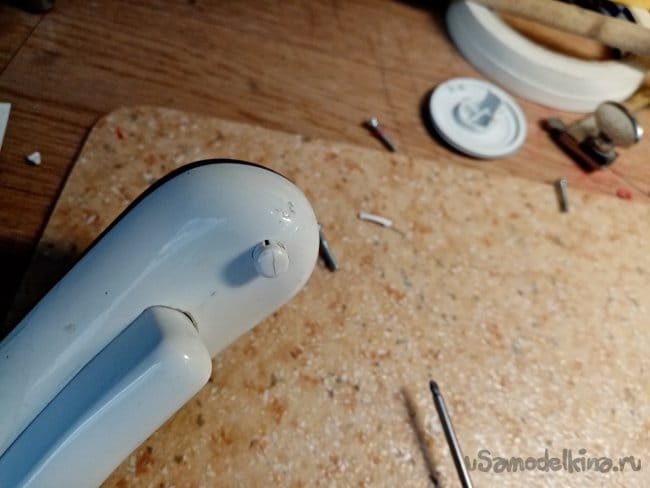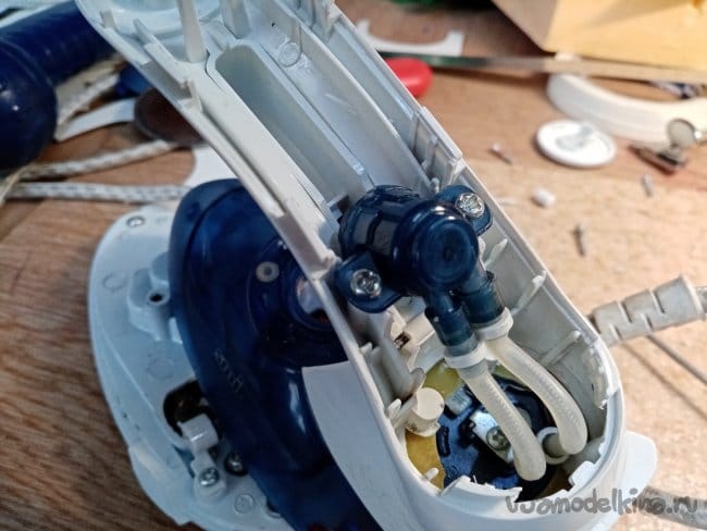 Весьма осторожно приподнимаю ручку, ага под ней шлаги насоса для увлажнения и пара. Откручиваю винты крепления и при помощи разных слов проталкиваю насос в отверстие ручки.