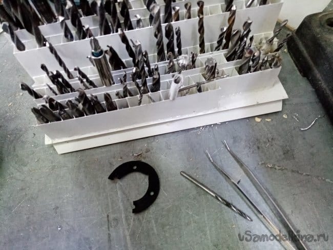 Пока ничего не вырезано, размечаю отверстия и засверливаюсь. Большой лист генитакса все-таки удобнее придерживать при сверлении, чем маленькую детальку. Сверла стоят по ранжиру в моем держателе. Который изготовил неделю назад. Для извлечения маленьких сверл есть даже пинцетик. Ну полная икебана!