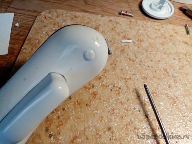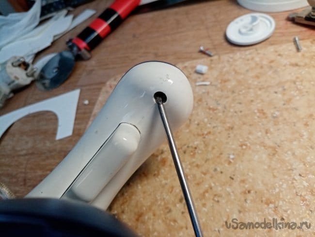 Спец инструментом расщелкиваю верх ручки, не снимается. Осторожно начинаю осмотр. Пупочка какая-то подозрительная. Выковыриваю. Есть еще один потайной шурупчик.