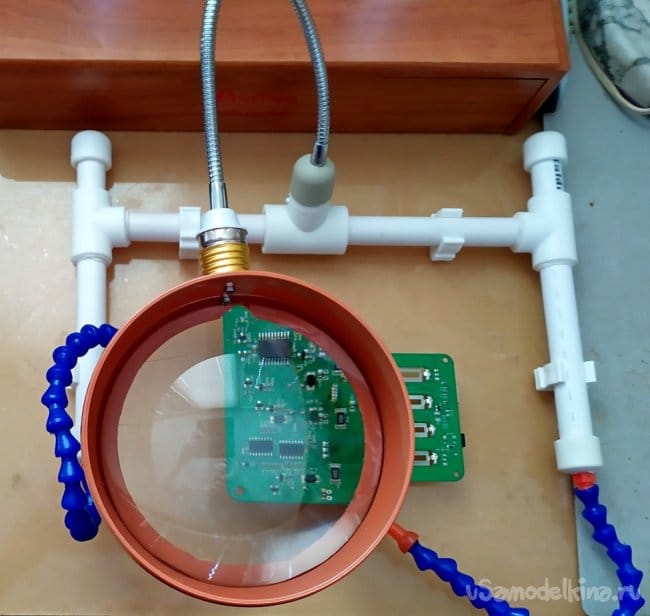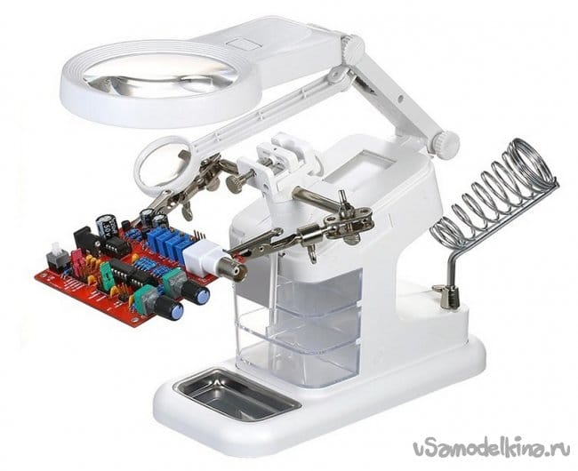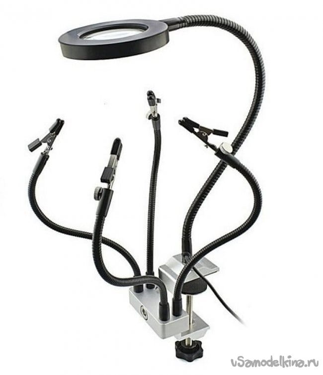 Работая по ремонту электроники или по сборке миниатюрных деталей и конструкций очень часто сталкиваешься с потребностью в дополнительном держателе. Также при такой деятельности без дополнительного визуального увеличения рабочей поверхности не обойтись. Уверен, что всем мастерам знакомо это чувство, когда не хватает третьей руки, а иногда даже и четвёртой. Без специальных приспособлений, таких как микроскоп или увеличительное стекло, особенно при пайке SMD компонентов на электронных платах, для качественного результата, такое приспособление - незаменимо.