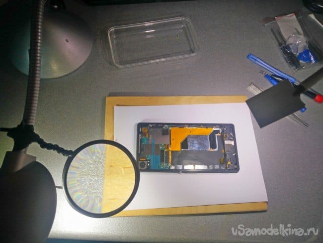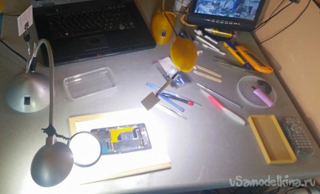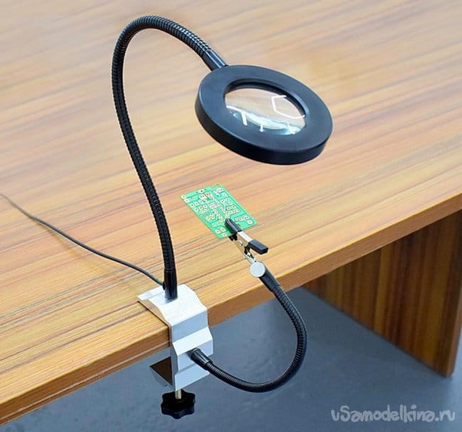 Я уже сталкивался с такой проблемой при ремонте электроники - такой, как мобильные телефоны или планшеты. При решении этой задачи, пришлось соорудить примитивную установку так называемой "третьей руки". На фото вы можете увидеть это простое приспособление состоящее из настольной светодиодной лампы, к которому я прикрепил небольшое увеличительное стекло и змеевик с "крокодилом".