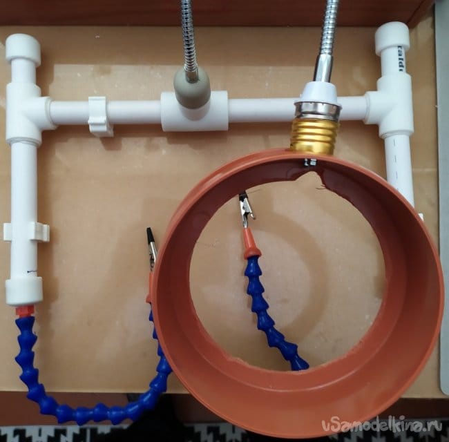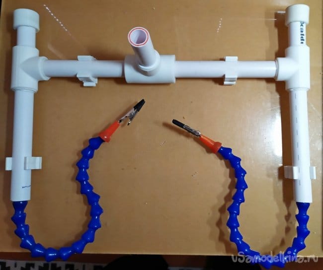 Для большей устойчивости, к штативу можно добавить пластиковые клипсы для полипропиленовых труб. Их также можно закрепить саморезами к основанию какой-нибудь поверхности, например к столу.