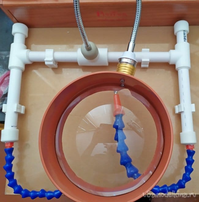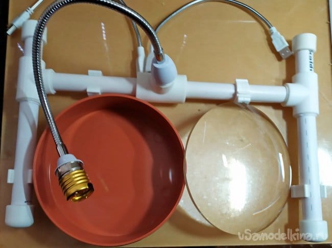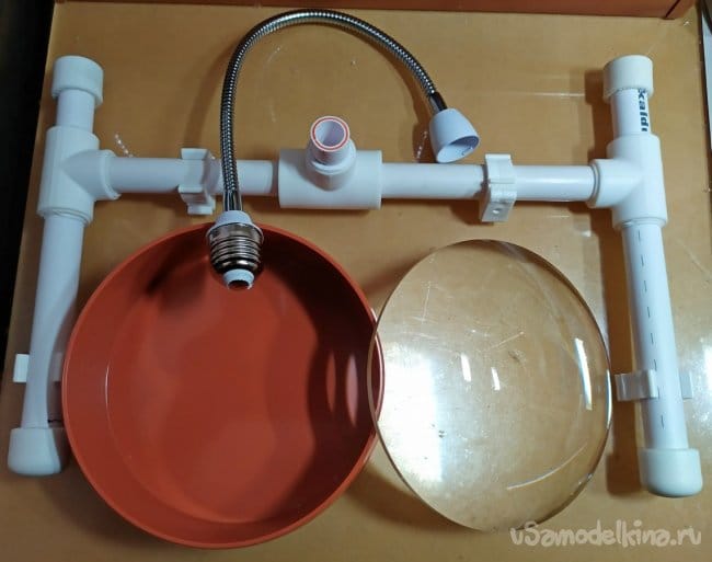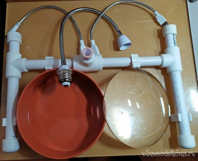 Из-за того что увеличительная линза диаметром 150 мм довольно-таки тяжёлая, последнюю надо было закрепить на устойчивом основании. Учитывая этот фактор основание изделия можно утяжелить. Для этого, изначально предполагалось разместить внутрь полипропиленовых труб, железную арматуру подходящего диаметра. Но в процессе сборки - этого не потребовалось. За счет Н образной формы, конструкция оказалась вполне устойчивой.