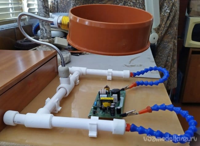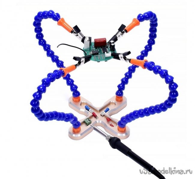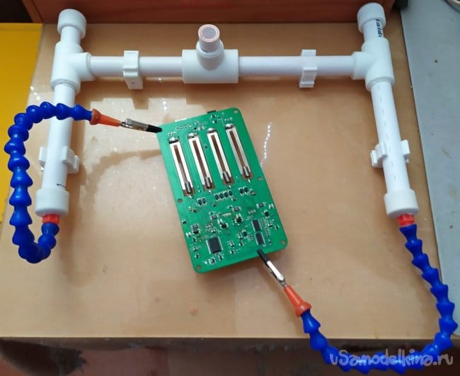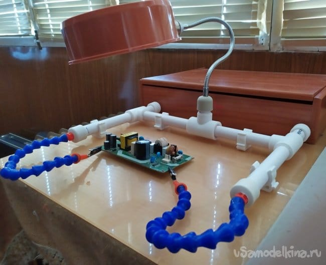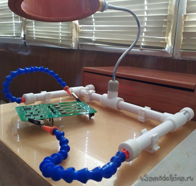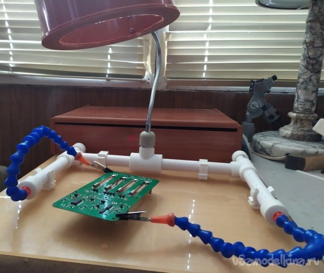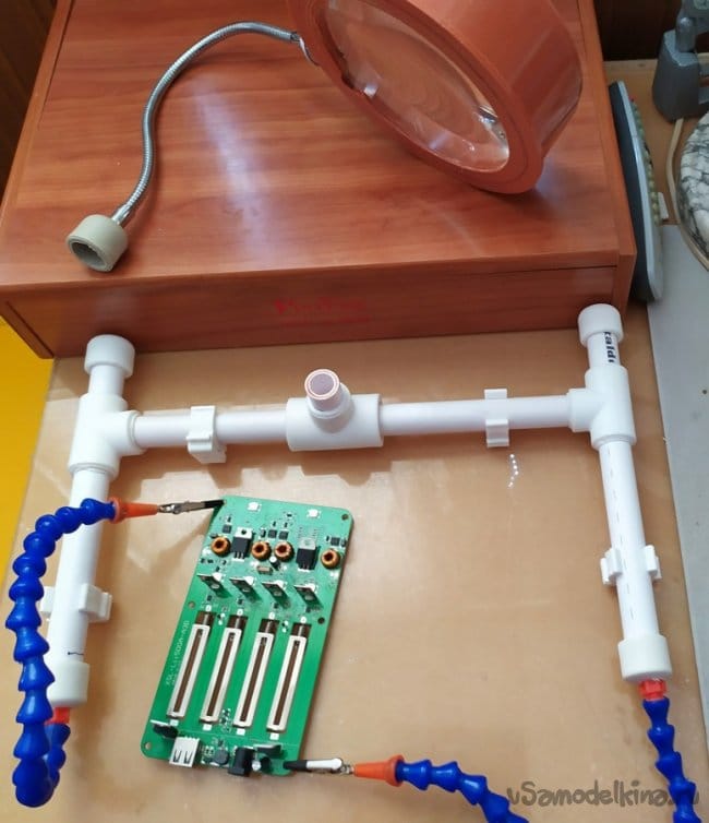 Как видно на фотографиях, такая конструкция "третьей руки" позволяет комфортно работать, удерживая платы электронных приборов, в удобном положении для их ремонта. К тому же это приспособление, всегда можно разобрать и хранить до востребования, не занимая много места.