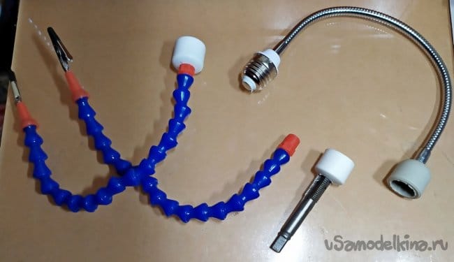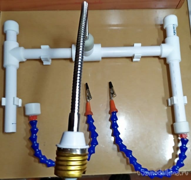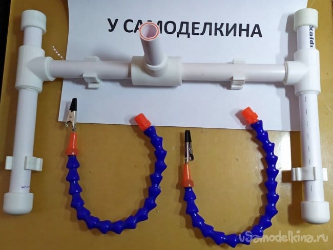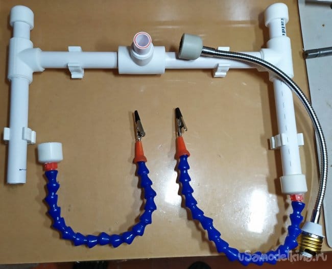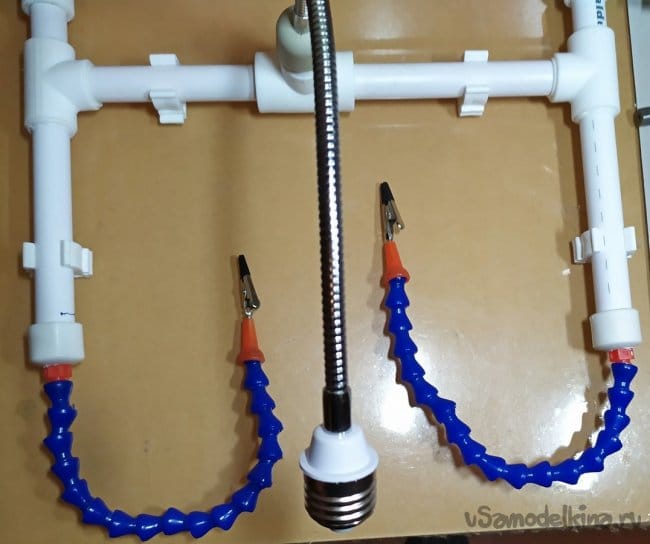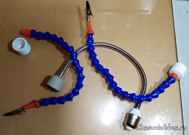 Детали которые мы подготовили, лучше сделать съёмными. Заглушки к которым закреплены наши щупальцы и держатель для лупы, лучше не клеить основательно к трубчатому штативу. Это позволит сделать наше приспособление более универсальным и в дальнейшем менять конфигурацию изделия.