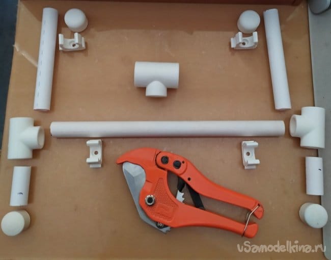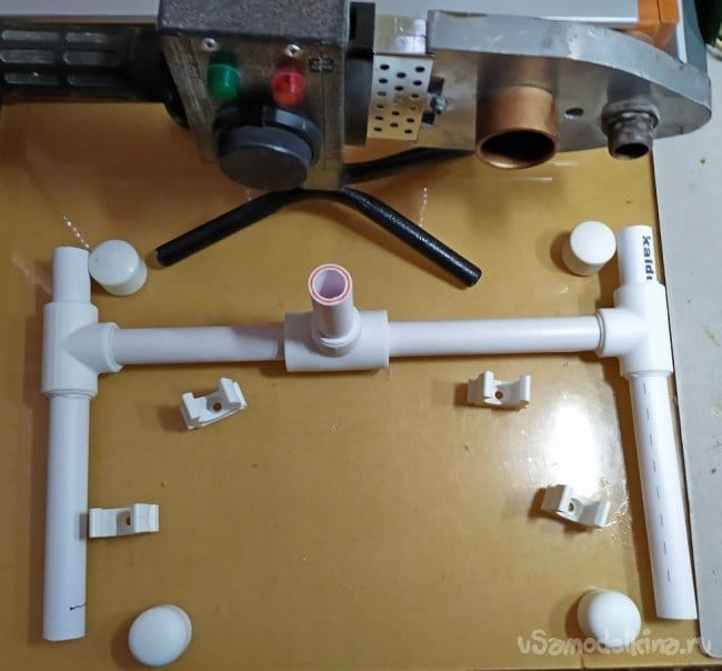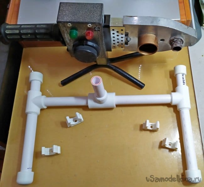 В комплекте паяльника по полипропилену, у меня есть специальные ножницы. Они имеют храповой механизм, будуще специально приспособленные для таких работ. Но, в отсутствие такого инструмента, можно использовать любой другой лобзик по металлу. Срезав заготовки по размерам, их нужно предварительно разместить на столе перед сваркой.