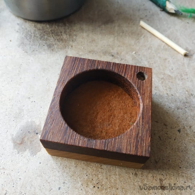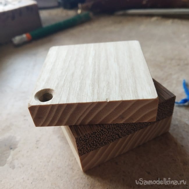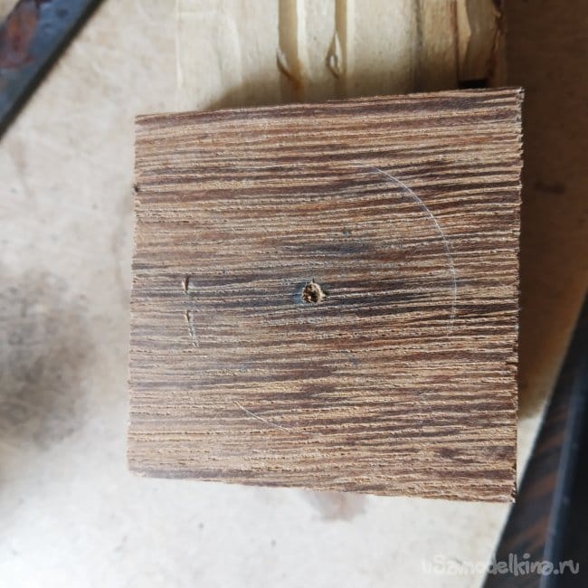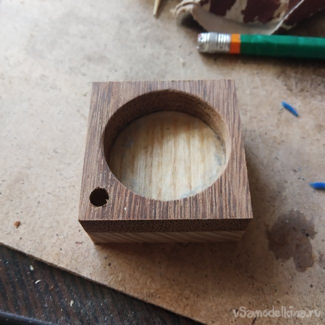 Винт в таких изделиях обычно располагается с угла, поэтому я нашел самый обширный угол на плашке сукупиры и наметил там отверстие. Ну и просверлил, конечно.