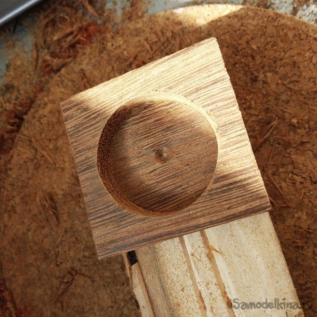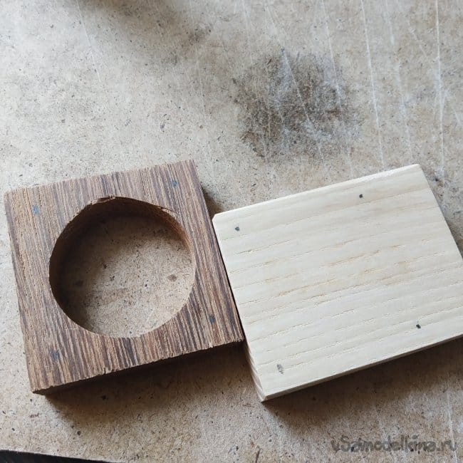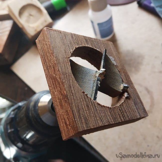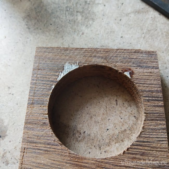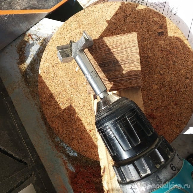 Вручную сверлить твердую породу сверлом форстнера не очень удобно, поэтому я решил прибегнуть к хитрости – приклеить плашку областью сверления к ненужному бруску и уже на нем сверлить. Сверло я взял на 35мм.