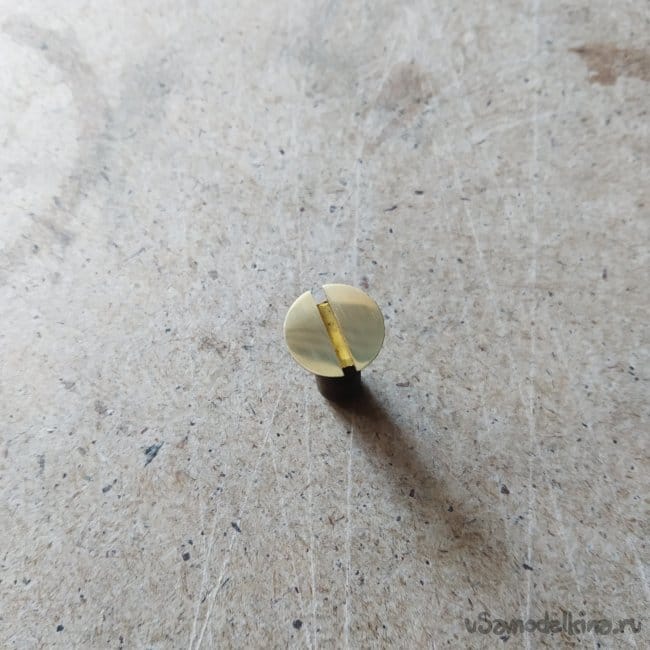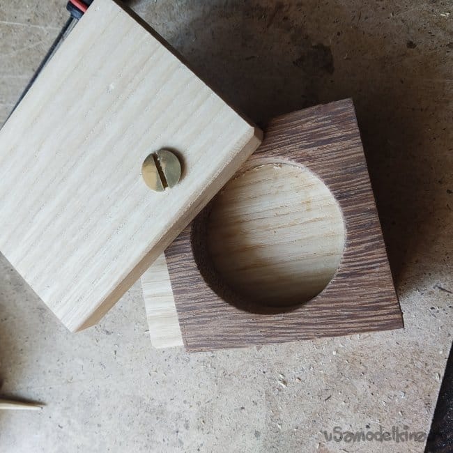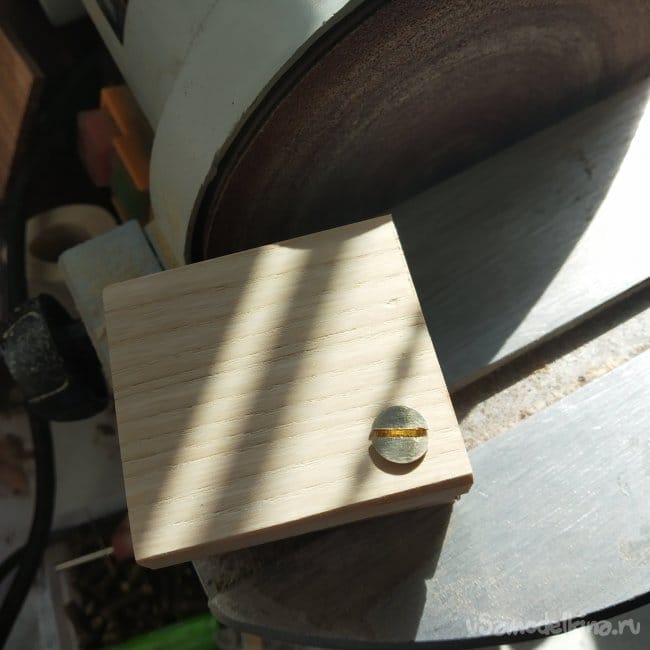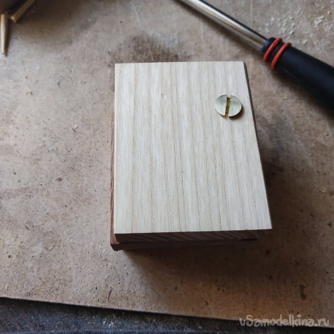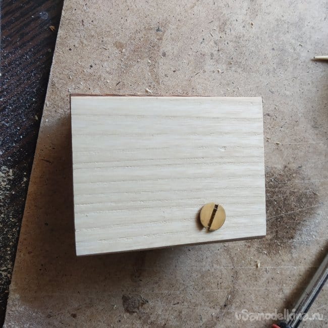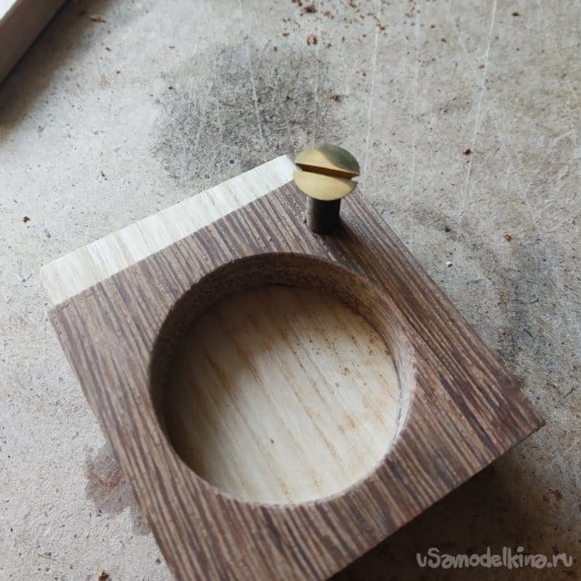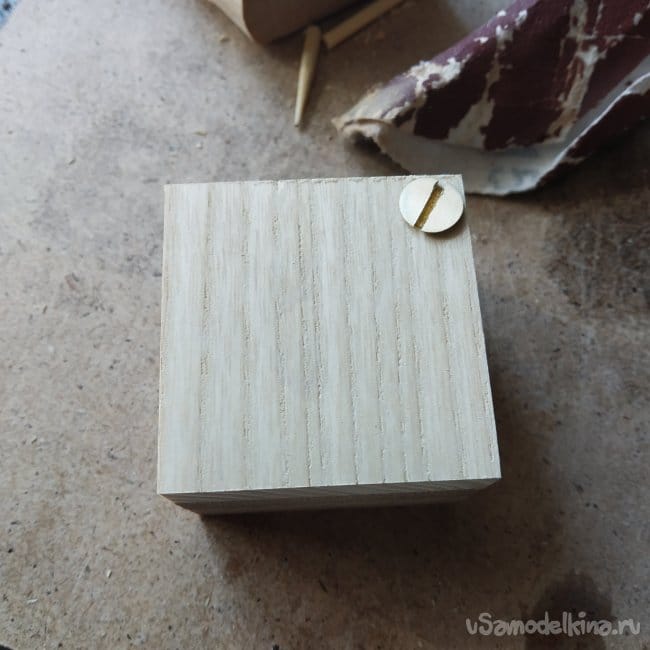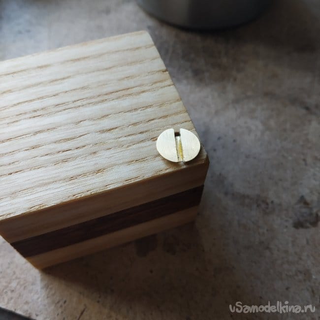 Поскольку мне лень было идти за фурнитурой для шкатулок, я решил сделать крышку осевой. То есть, она будет не открываться, а прокручиваться. Для оси я взял старый латунный винт, который предварительно зачистил и полирнул.