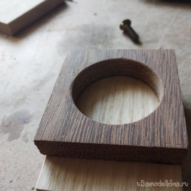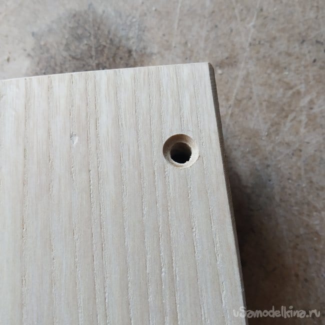 Далее я примерно разметил и просверлил на этот раз сквозное отверстие в крышке из ясеня. Отверстие я также раззенковал, чтобы винт не сильно выделялся над крышкой.