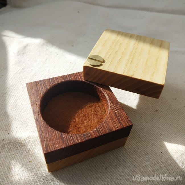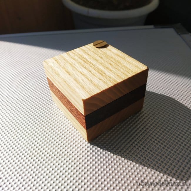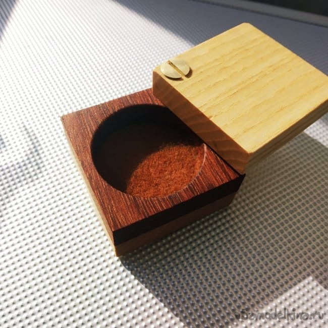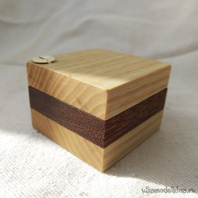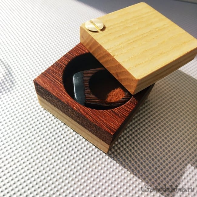Вот такая шкатулка получилась. Размер ее идеально подходит для колец разных форматов, мелких подвесок и всякой подарочной мелочевки. Данный вид изделий хорошо подходит для начинающих столяров даже без станков. Создание, конечно, может затянуться на весь день (у меня это заняло несколько рабочих часов), но результат того определенно стоит. Также очень меня радует то, как раскрылась древесина на этом изделии – несмотря на абсолютную разность видов и происхождений пород, шкатулка выглядит гармонично и породы даже стали в чем-то похожи, особенно на продольной стороне. В общем, довольно неплохая работа получилась.