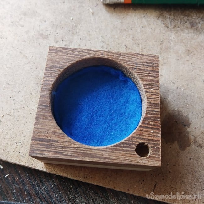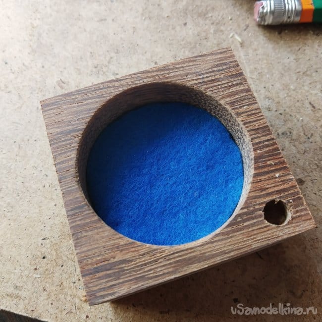 Поскольку это шкатулка предполагается подарочная, дно я решил выстлать фетром, чтобы закрыть это самое дно и не заморачиваться с его шлифовкой и доводкой. Ну и чтобы цивильно было. Фетр я взял сначала синий, так как он неплохо сочетается с общей цветовой гаммой шкатулки. Для этого я приложил лист фетра к открытой шкатулке и карандашом разметил круг по граням.