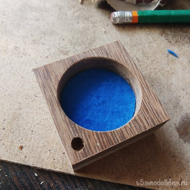 Далее я тщательно протер шкатулку чистой тряпкой и вклеил новый кусочек фетра, на этот раз, коричневый. С ним презентабельнее смотрится. Приклеивал я его на резиновый клей типа момента. Нагрузки никакой на фетр, поэтому со склейкой я не заморачивался. Главное, чтобы фетр не приклеился сразу, потому что ровно его положить на дно при всем желании не получится.