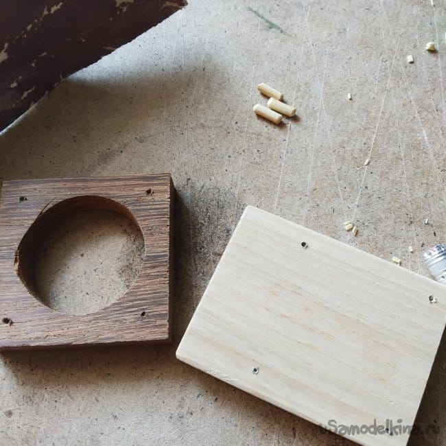 Далее я решил придать жесткости шкатулке, а именно, склеить ее на шканты. Шканты я сделал из бамбуковых шпажек, так как они достаточно прочные в мелких деталях и мне лень идти за нормальными шкантами в магазин или вытачивать их из бука, например. Я разметил под них отверстия и просверлил эти самые отверстия.