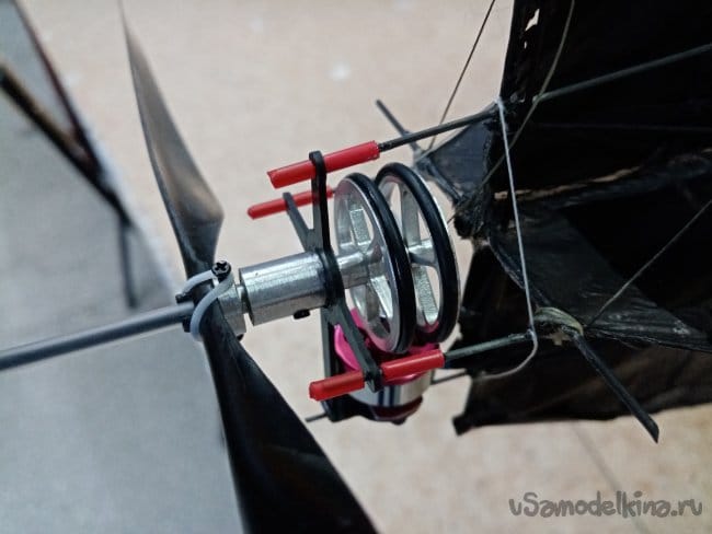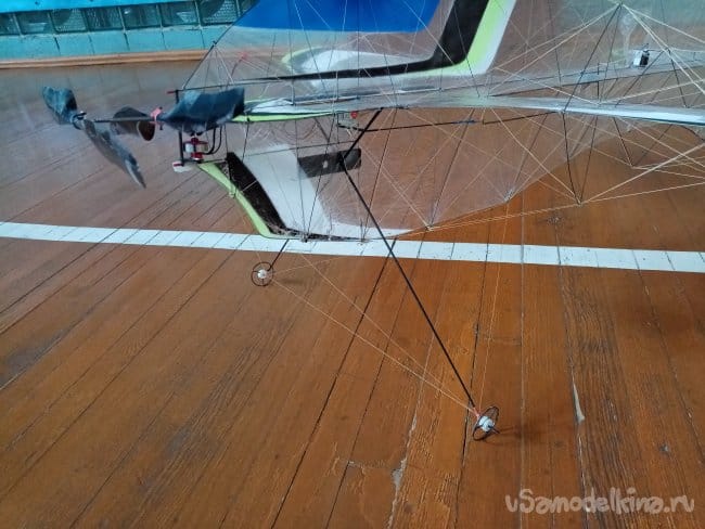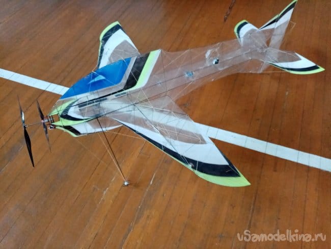 Такой вариант силовой установки позволяет компенсировать крутящий момент довольно больших винтов на легонький самолетик. Полетным весом примерно в 60 грамм. Размах 90 см, длина 110 см.