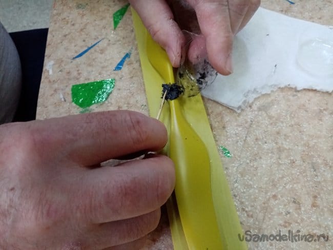 Остатки ткани режем роликом в труху, она понадобится для формирования элементов усиления в центральной части винта.