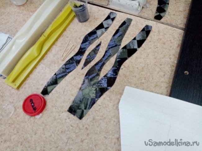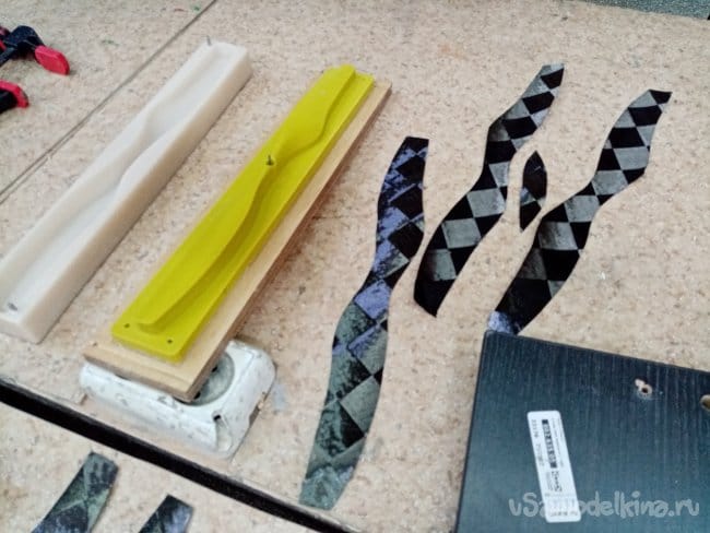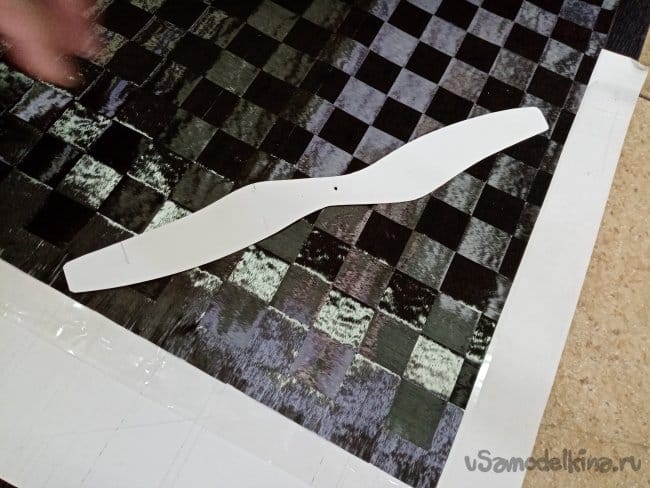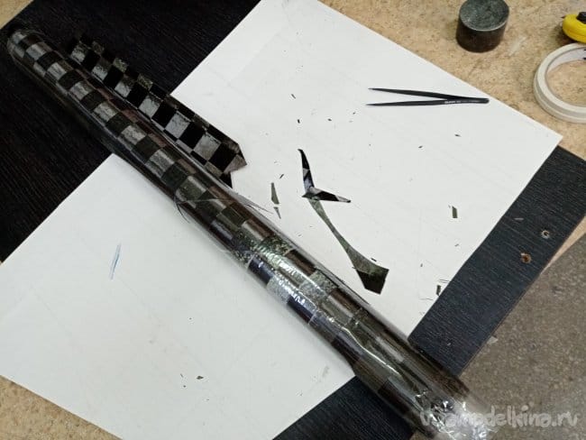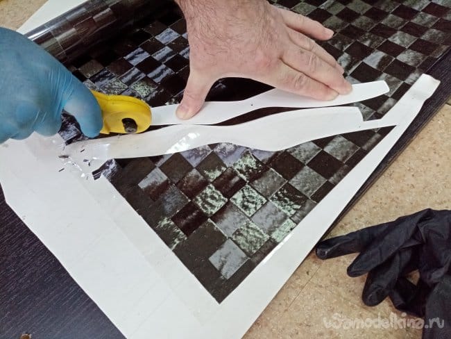 Пока матрица отстаивается начинаем раскрой карбоновой ткани. Так называемой "шахматки". Слои идут наискосок под углом. Для более качественного реза подкладываем мебельный щит, на него плотный ватман. Режем роликовым ножом по шаблону.