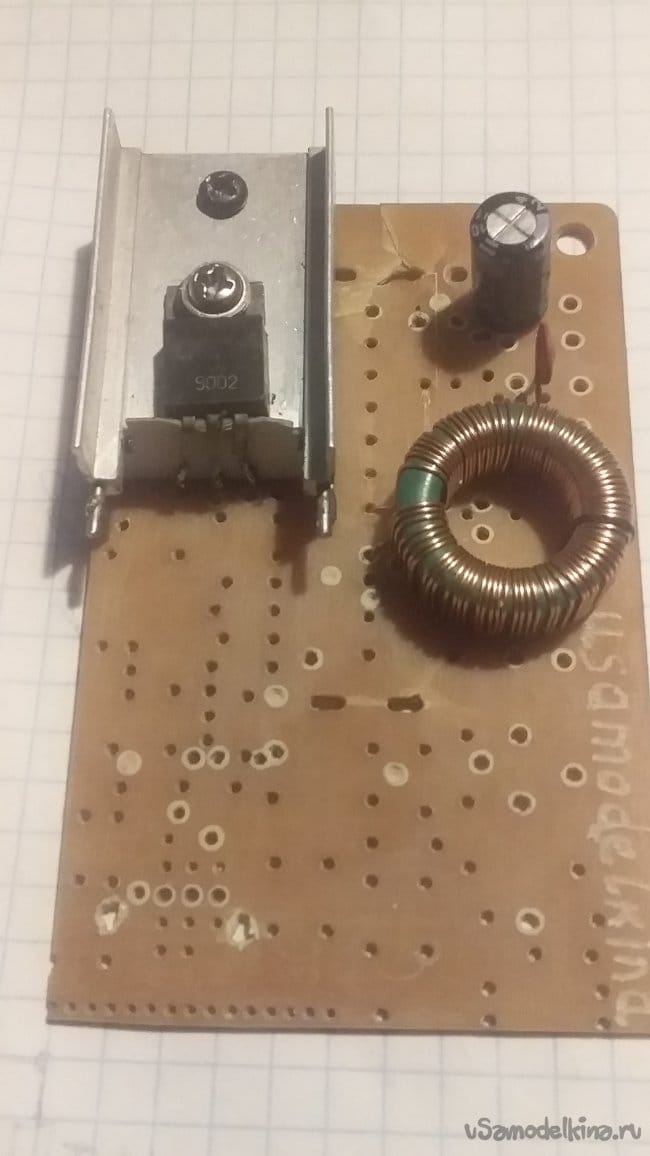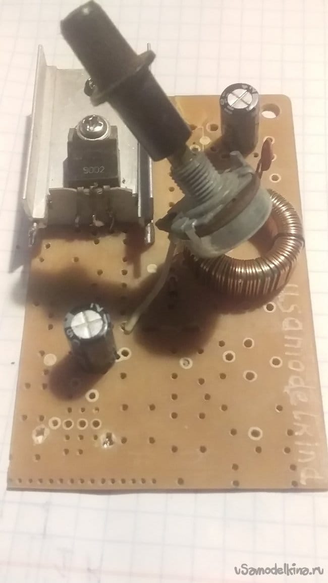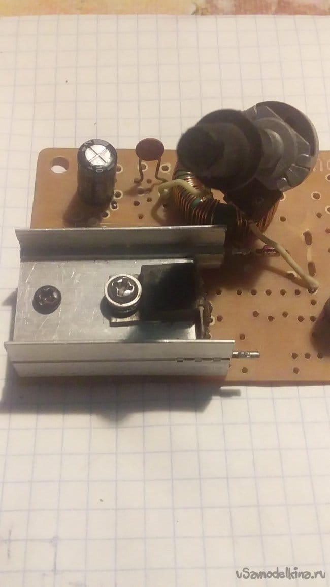 Далее устанавливаем транзистор на радиатор и прикручиваем его к текстолиту. Для защиты контактов от замыкания о радиатор, можно установить картонную перегородку как в моём случае.