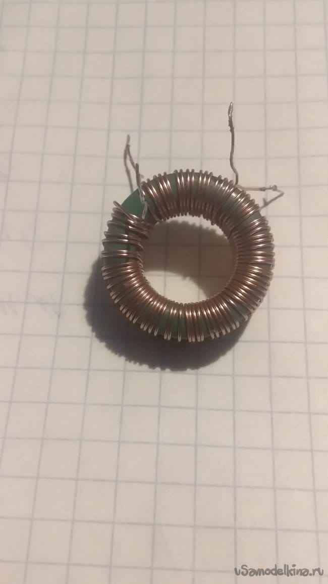 Сначала мотаем 60 витков первой обмотки, потом наматываем еще 16 витков на оставшемся месте в том же направлении, что и первая. Сердечник можно взять прямоугольный, от сетевого фильтра или же Ш-образный, главное чтобы был ферритовый.