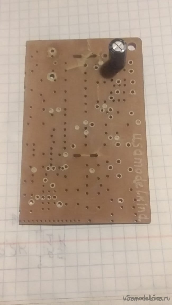 Теперь ставим электролитический конденсатор на выход. "Плюс" конденсатора припаиваем к катоду, а "минус" к эмиттеру транзистора и "минусу" первого конденсатора.