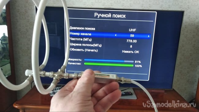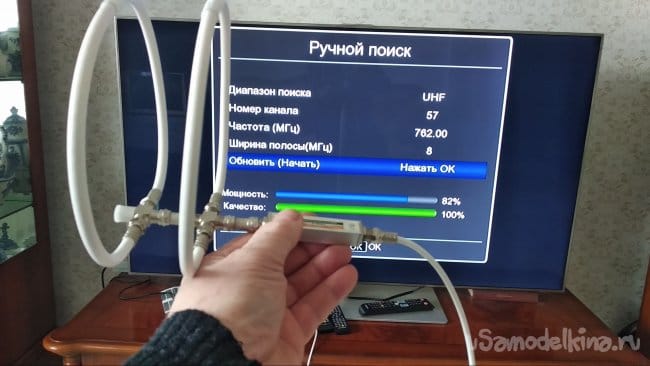 В моих условиях, в ста метрах от венца, на первом этаже и расстоянии в 95 км., судя по «Яндекс картам», от ретранслятора, находящегося в другой области, при применении проходного усилителя, качество сигнала с такой антенной на обоих пакетах каналов, а у меня это 57 и 59, составило 100%.