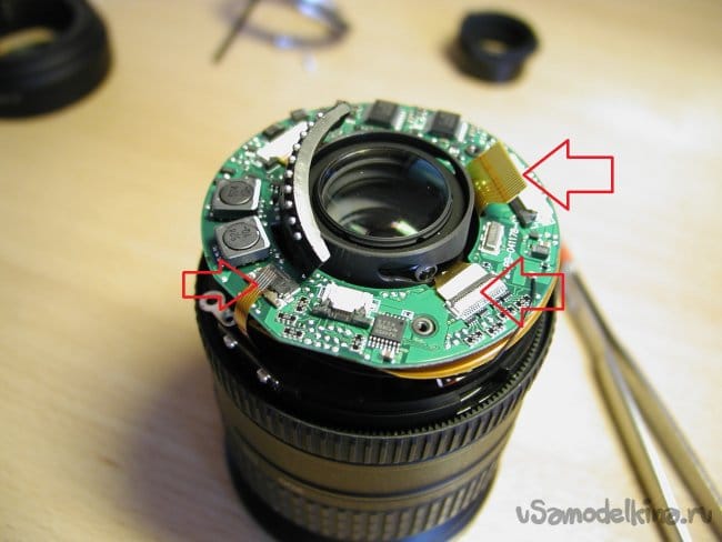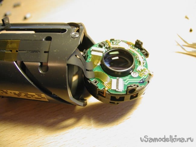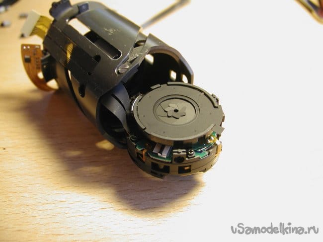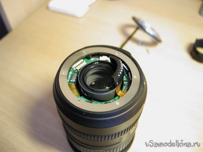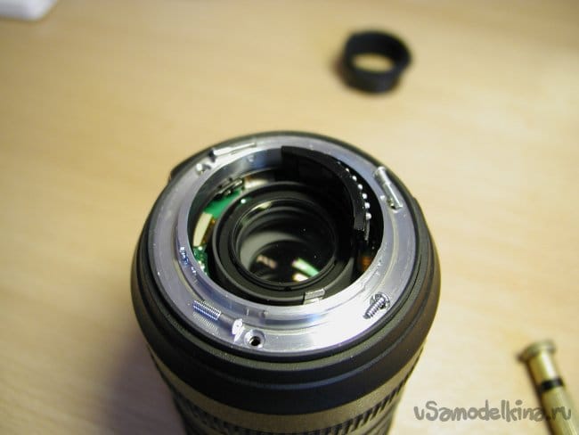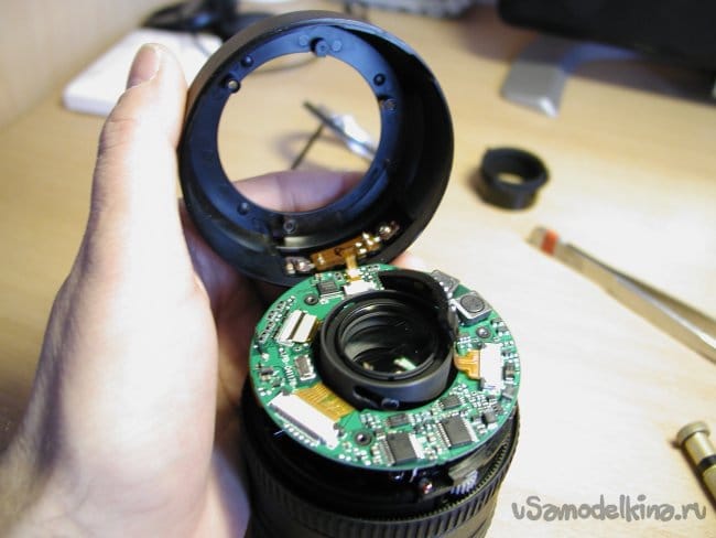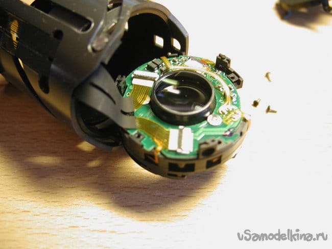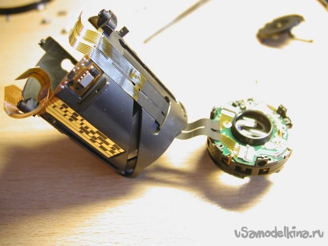 Снимаю первое кольцо сразу за байонетом, и опять осторожно! Под ним шлейф от кнопок на кольце к основной плате.