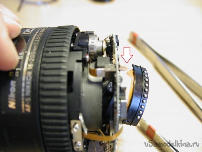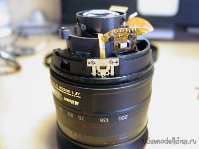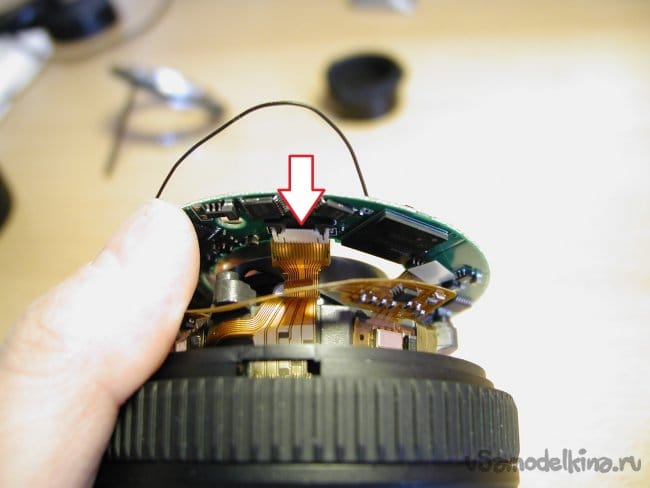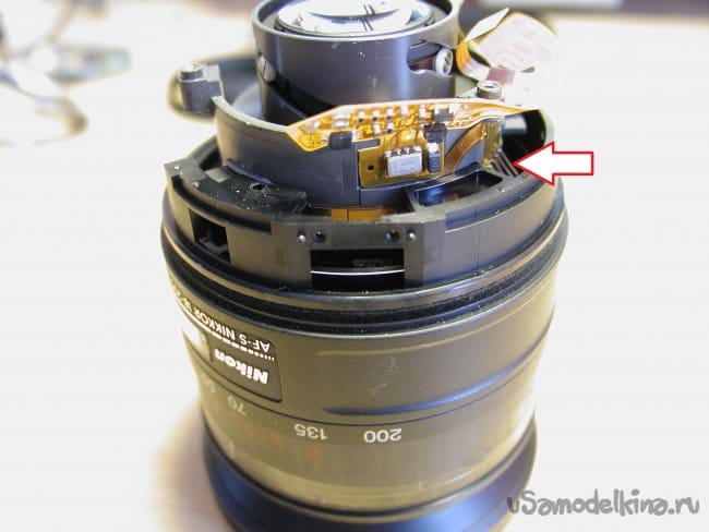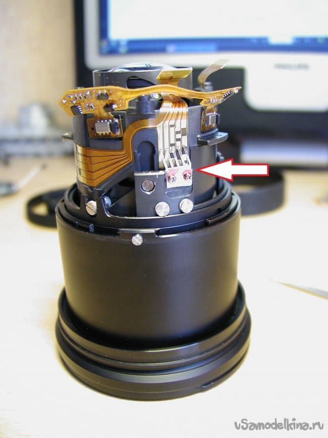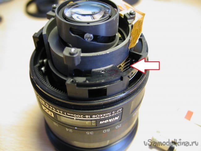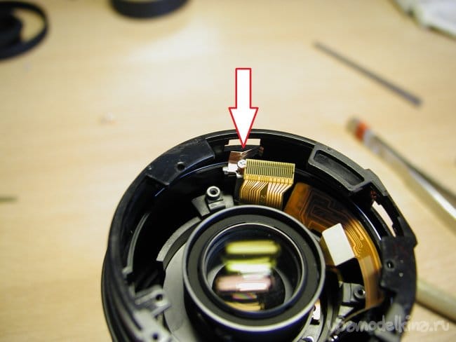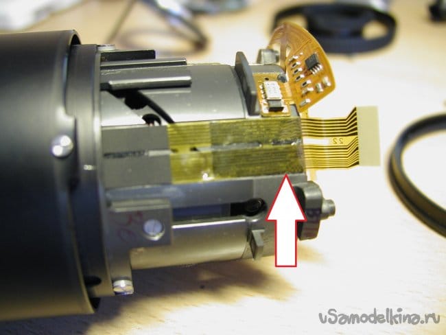 Затем блок очень маленькой и тонкой гребенки контактов, которая сообщает о положении зума. Обращаюсь максимально осторожно при снятии. Погнуть очень просто. Можно уронить внутрь конструкции объектива, тогда вообще капец.