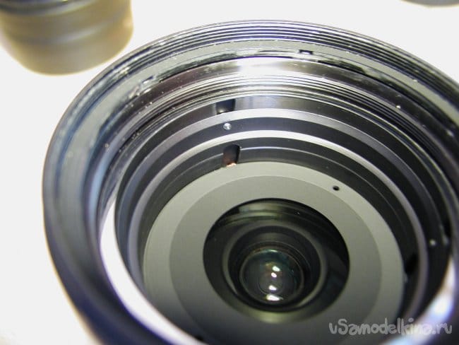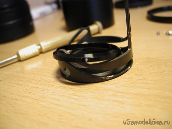 Внутри несколько тонких металлических пластинок коррекции фокуса. Извлекаю осторожно, согнуть их очень легко.