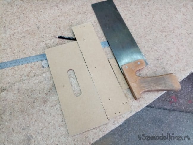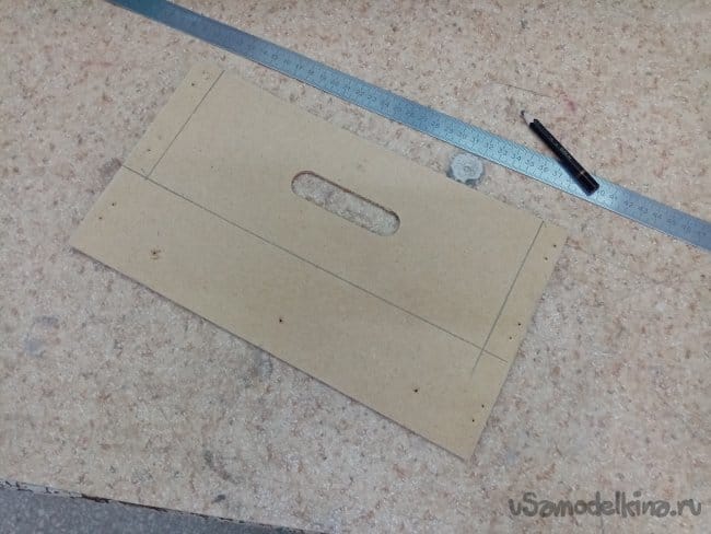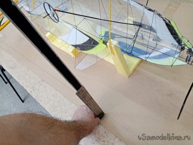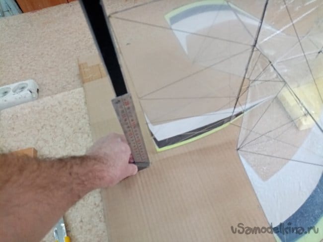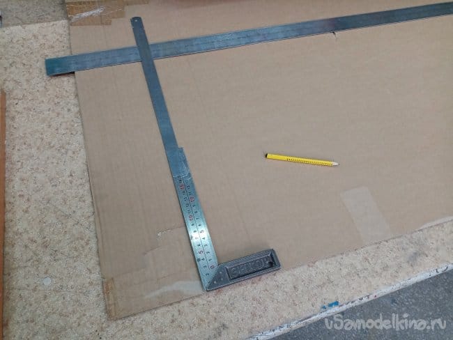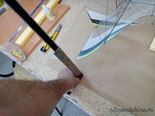 Принцип изготовления не менял. Закрепленный на стапеле самолет устанавливаю на картон и при помощи угольника вычерчиваю контуры дна коробочки. С минимальными припусками относительно модели. Высоты угольника не хватило для нормальной разметки. Приклеил дополнительно линейку в 50 см.