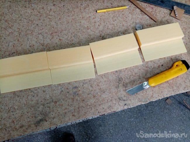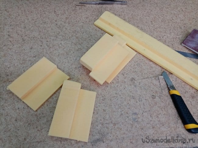 Для крепления стапеля с установленной моделью вырезаю из утеплителя фиксирующие бруски. Установив модель, монтирую бруски при момощи термопистолета.