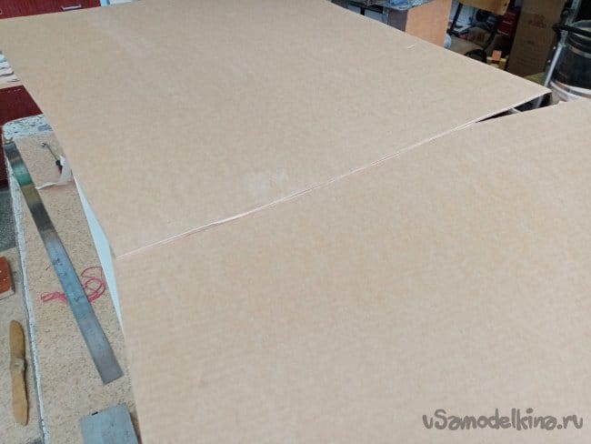 На одну из крышек не хватило малость картонки. Изготовил её по частям. Сначала одну половину, затем вторую. Прикинул размеры по коробке, отчертил линию склейки. Затем склеил титаном и после прижал грузами.