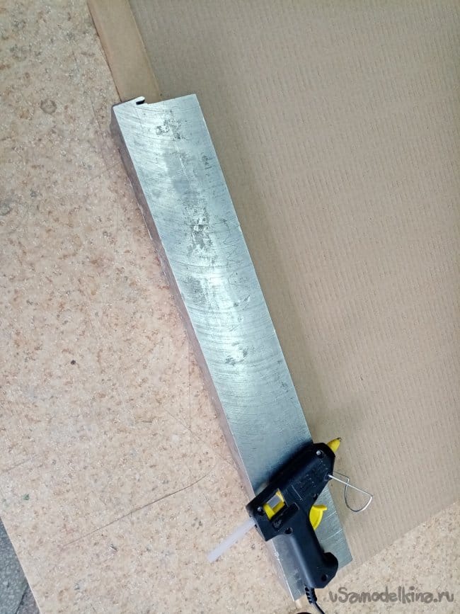 Затем место сгиба проклеиваю термопистолетом, прижимаю массивным металлическим бруском.