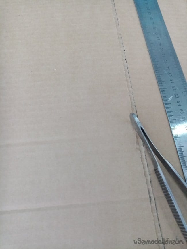 Затем нужно отогнуть бортик для приклейки. Размечаю на картоне и при помощи обратной стороны пинцета формирую канавку как направляющую для сгиба. Затем осторожно сгибаю по разметке.