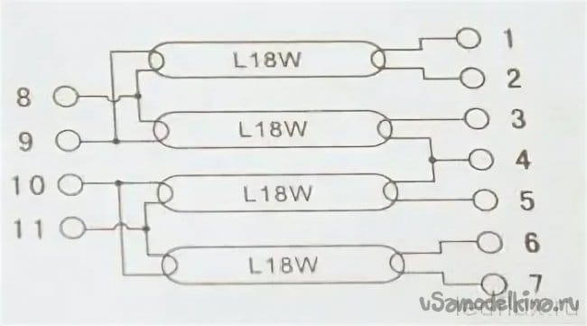 Типовая схема бюджетного ЭПРА 4Х18 Вт примерно такая.