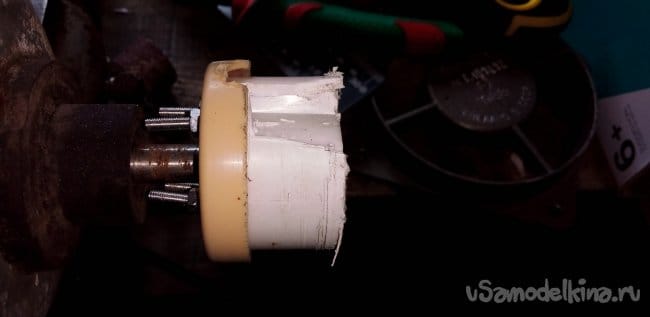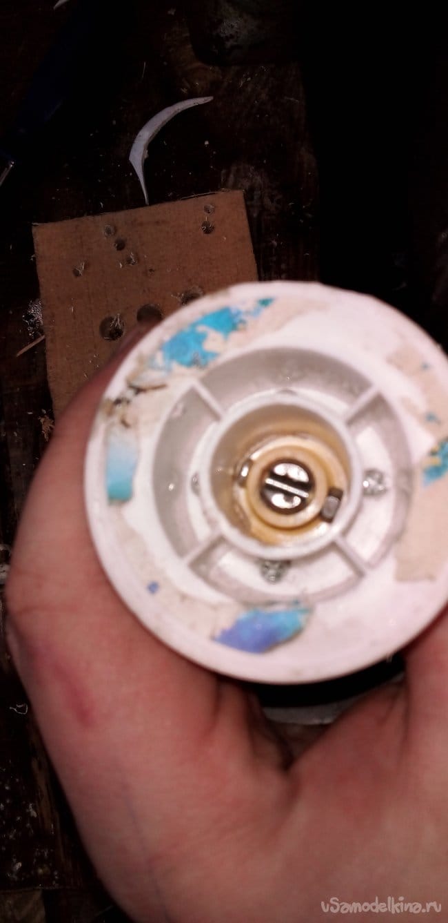 Теперь нужно взять барабан. У меня это барабан от припоя, я с него срезал нижний бортик. И его крепим на перевёрнутую шайбой на четыре болтика м3 в каждый сектор.