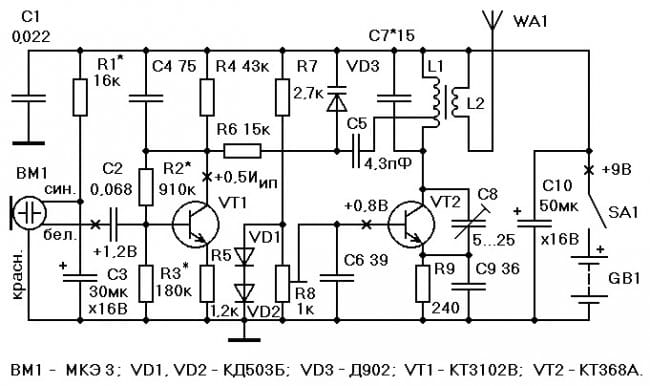 Микрофонный усилитель, входящий в состав электретного микрофона МКЭ-3, питается нестабилизированным напряжением через Г - образное RC - звено (R1*С3) и обеспечивает на выходе напряжение ЗЧ до 30 мВ. Этот сигнал через разделительный конденсатор С2 подаётся на вход усилителя, собранного на транзисторе VT1. Для улучшения температурной стабильности работы каскада напряжение смещения на базу VT1 подаётся с коллектора через резистор R2, а цепь эмиттера введён резистор R5. Конденсатор С4 является блокировочным и срезает ВЧ - составляющие, проникающие в цепь УЗЧ от генератора, собранного на ВЧ - транзисторе VT2. Каскад на транзисторе VT2 представляет собой генератор РЧ, собранный по схеме ёмкостной трёхточки. Резистивный делитель R7, R8 определяет И смещ. (напряжение смещения), подаваемое на базу VT2. Транзистор VT2 работает в режиме отсечки - классе С - и поэтому И смещ. на базе VT2 может выбираться в пределах +0,8 … +1,2 В. Параллельно подстроечному резистору R8 включены два кремниевых диода, которые стабилизируют И смещ. на базе VT2 и при разряде батареи минимизируют уход частоты генератора. Транзистор VT2 охвачен положительной обратной связью, созданной посредством подключения к коллектору и эмиттеру конденсатора С8. Конденсатор С8 выбран подстроечным для облегчения введения в режим генерации транзистора VT2. В цепь коллектора VT2 включён параллельный колебательный контур, состоящий из катушки L1 и конденсатора С7*. Точное значение индуктивности L1 устанавливается сердечником из латуни или феррита. (Введение в L1 латунного сердечника даёт меньшую прибавку индуктивности катушки по сравнению с введением ферритового сердечника). Частотный модулятор собран на элементах R6, VD3, C5. При подаче с выхода УЗЧ через резистор R6 напряжения ЗЧ, варикап VD3 изменяет свою ёмкость пропорционально обратному напряжению смещения, выделенному из сигнала ЗЧ. С анода варикапа VD3 через конденсатор связи С5 модулирующее напряжение подаётся на отвод (4-й сверху виток) катушки L1. Это сделано для уменьшения глубины модуляции. В упрощённом («безотводном») варианте изготовления катушки L1 правый вывод конденсатора С1 может подключаться к нижнему выводу катушки L1. Уменьшить глубину модуляции можно также уменьшением ёмкости С5 или применением в качестве VD3 варикапа с меньшим коэффициентом перекрытия по ёмкости. На практике при появлении перемодуляции (девиации более 150…250 кГц), следует в первую очередь уменьшить ёмкость конденсатора связи С5.