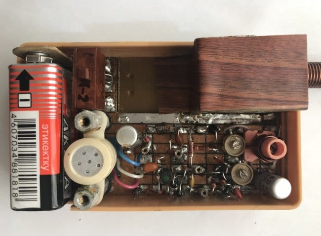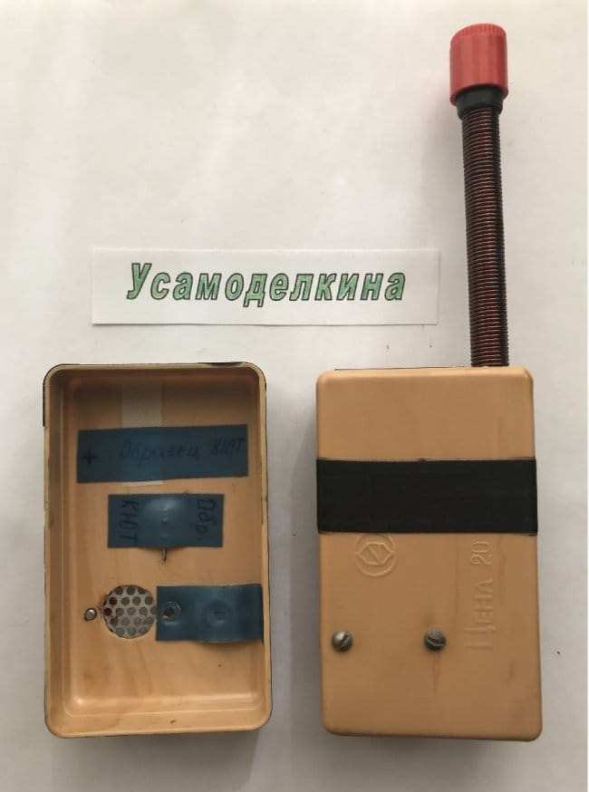 Обратите внимание, что для удалённой работы РМ достаточно не выдвинутой из приёмника магнитолы телескопической антенны. Правда, если между РМ и приёмником две ж/бетонные стены, то такой фокус не удаётся. Не удаётся он и в прямой видимости на расстоянии более 20 ... 40 метров. При антенне, полностью выдвинутой из приёмника, дальность связи значительно возрастает. Наиболее внимательные читатели заметили какой-то слабый равномерный свист. Спешу Вас заверить, это не радиомикрофон. Свистит умножитель напряжения постаревшей магнитолы «Радиотехника ML-6102», который встроен в магнитолу для питания варикапов блока настройки приёмника.