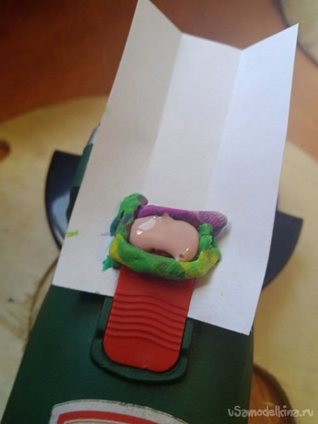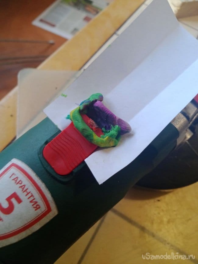 Получилось, но, мне кажется, недолго она там проживёт. Решено сверху налить моей любимой эпоксидки. Так как разбирать снова было лень, я решил клеить на месте, и чтобы Хват не растекался, пришлось соорудить что-то типа обрешетки из бумаги и пластилина.
