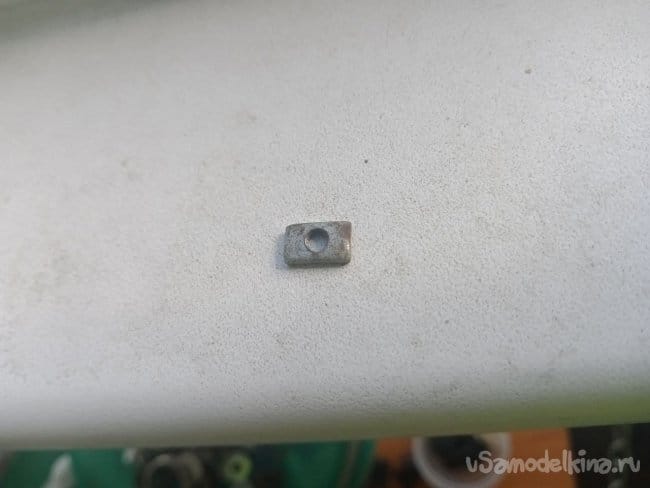 Над статором видны защёлки кнопки, их надо пинцетом изнутри подсжать, и отвёрткой сверху подвытащить кнопку. Органолептический осмотр показал, что защёлка исчезла, стёрлась, сломалась. Нету её. Придумываем замену. Не пластик, он, очевидно, тоже быстро исчезнет, чехи фигню придумали. На балконе находим маленькую железку с резьбой, видимо когда-то это было частью советской розетки.