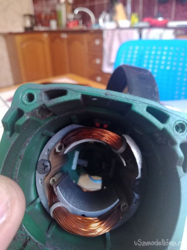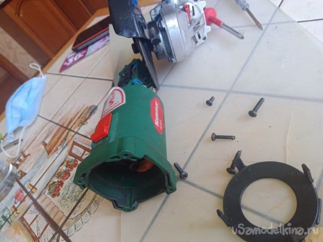 Итак, разбираем болгарку по кругу, 5 саморезов, достаём пластиковую манжету (надо просто её вытянуть), потом ротор.