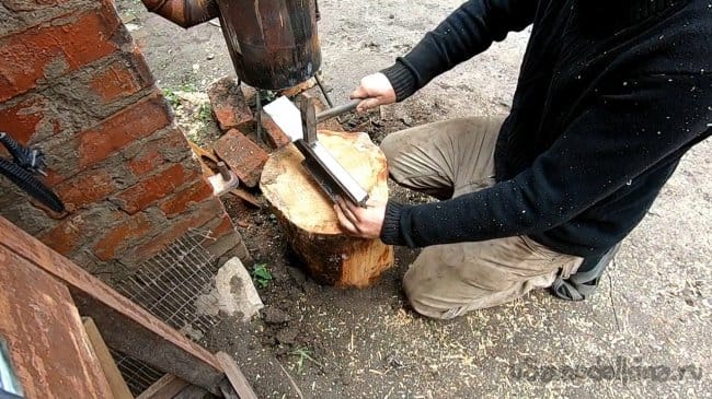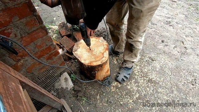 Просверлил в пне отверстие сверлом на 10, пень у меня из береста, древесина эта не колется, она очень вязкая. Пень немного прикопал, чтобы все было устойчиво. В итоге наковальню осталось забить молотком, держится пока отлично.