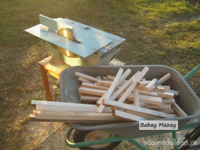 На циркулярной пиле с параллельным упором напилил брусочков одинаковой высоты (Фото 7). Внутренние поверхности щитов ДСП подготовил – выковырял остатки крепежа, зашкурил крупной наждачкой, разметил. Наклеил брусочки слоем изнутри щитов (Фото 8). Клей Бустилат – недорогой, прочный, нетоксичный.