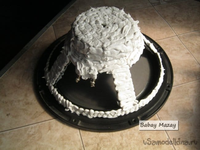 Корзину динамика задемпфировал – промазал толстым слоем акрилового герметика. Получился слой, в среднем около 4..5 мм. Структура и консистенция застывшего акрилового герметика весьма похожа на специальные антишумовые покрытия, например автомобильные, но несравненно удобнее в применении для некрупных железок. Герметик не стекает, не токсичен, его можно наносить сразу толстым слоем (Фото 13).