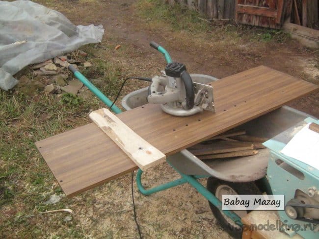 Первым делом выкроил заготовки стенок корпусов АС – осмотрел и разметил имеющиеся щиты, выпилил заготовки. Длинные узкие резы делал на циркулярной пиле с параллельным упором, короткие широкие – пилой ручной дисковой, пришурупив временный технологический упор-дощечку (Фото 3).