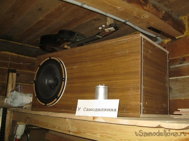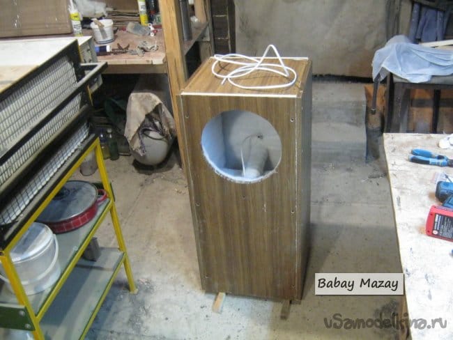Сквозь заднюю, еще не установленную стенку, подготовил и пропустил соединительный кабель – обычный осветительный, в двойной изоляции, значительного сечения. Отмерил кусок кабеля, зачистил концы от изоляции, залудил. Просверлил отверстие напротив и чуть ниже динамика, пропустил конец кабеля, закрепил снаружи и внутри жестяными хомутиками с короткими саморезами. Замазал щели герметиком.