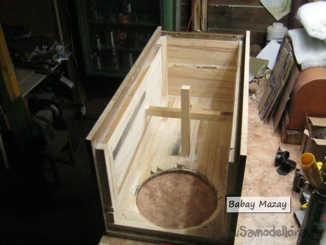 Отделал внутренние поверхности 1 см. синтепоном. Он прекрасно наклеивается тем же Бустилатом – вырезал из рулона заготовки, примерил, густо намазал клеем горизонтальную деревянную поверхность, уложил и чуть прижал лист синтепона. Нижние его волокна насмерть вклеятся, основная же часть, как и требуется, будет мягкой и распушенной. Единственный момент – клеить приходится только на горизонтальную поверхность иначе стечет клей, т.е. одну стенку за раз. Следующую только после высыхания предыдущей. Распорки также промазал клеем, обернул полосой синтепона и прошил края (Фото 12).