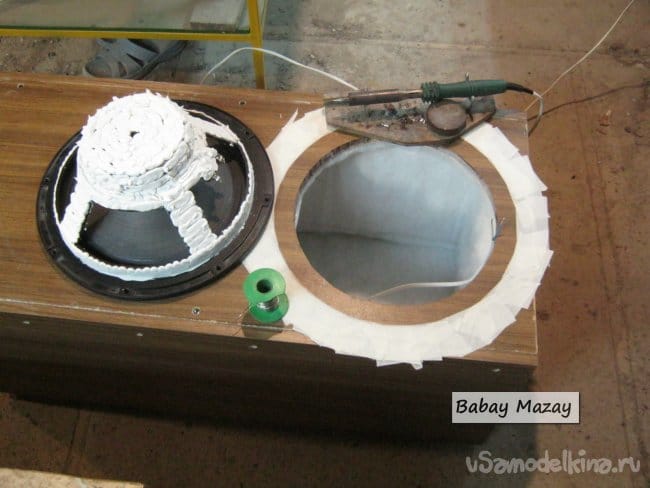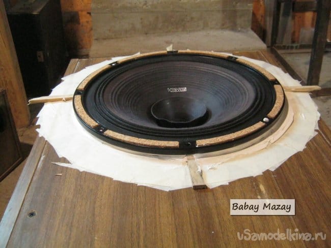 Динамическая головка должна быть механически отвязана от корпуса – герметично установлена через толстую резиновую шайбу и специальный крепеж. Здесь, применен силиконовый герметик. Головка установлена в корпусе с некоторым горизонтальным зазором и не касается его. На место установки и фланец головки нанесены несколько слоев герметика и динамик пришлепнут на свое место через четыре технологические прокладки – деревянные щепочки одинаковой толщины, чуть больше 4 мм. (Фото 17). Выдавленный герметик удалил бумажными салфетками.