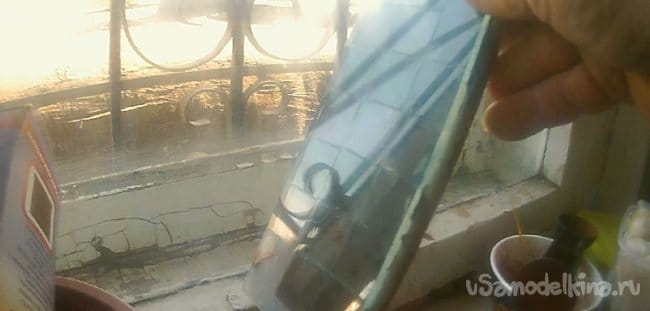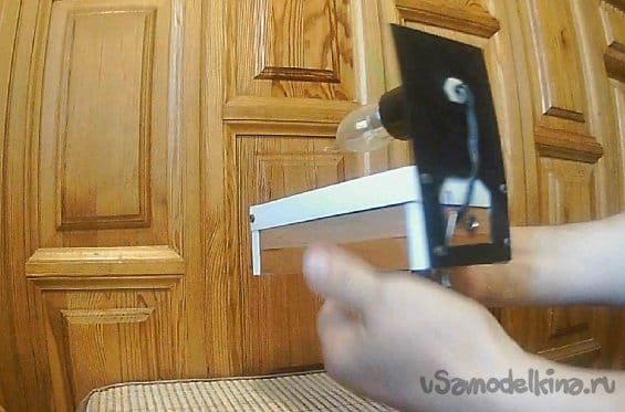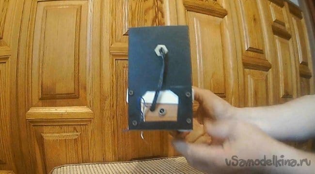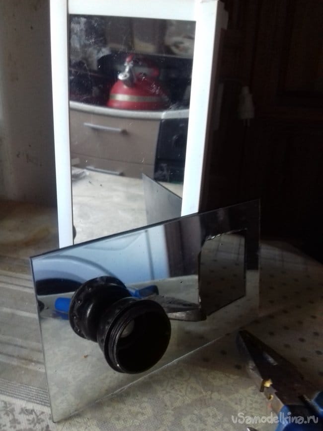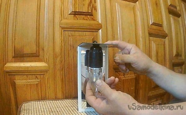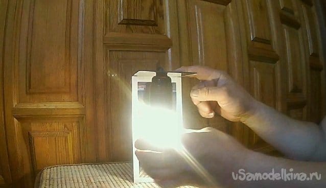 Спаял аккумуляторы, подключил вольтметр и солнечную панель, сборка закончена. Осталось лампу пристроить. Из зеркального пластика вырезал козырек и на него закрепил патрон. Здесь же, в верхней части, разместил разъем, для подключения более мощной панели.
