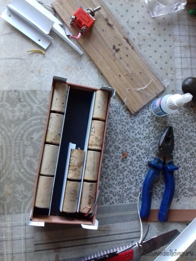 Аккумуляторы разместил из расчета, чтобы осталось место под провода и вольтметр, а саму лампу, она не греется, буду включать завинчиванием.