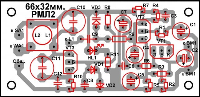 После макетирования и удачной настройки, для РМЛ2 была разработана ПП (печатная плата). Схема расположения деталей РМЛ2 на ПП показана на рисунке 2: